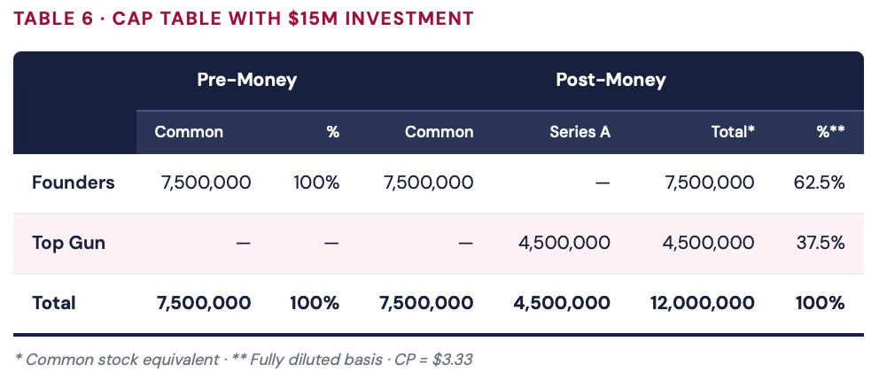 Note: if both investment and PMV increase by the same relative amount, the cap table doesn’t change — the investor’s ownership fraction is simply I / PMV. Scale both by the same factor and the ratio stays put.