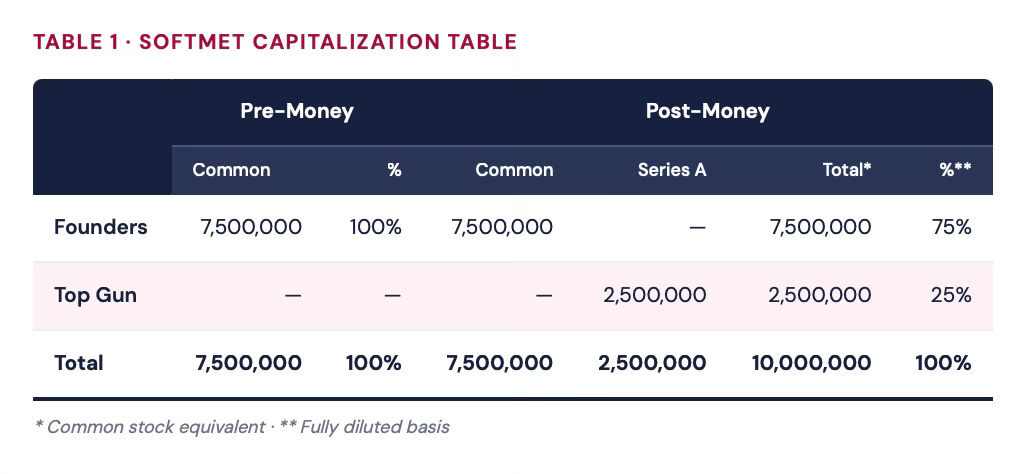 Let’s look at SoftMet. Before the round, its founders were the only owners of the company — they owned 7.5 million common shares. After Top Gun acquires 2.5 million Series A Preferred shares (each convertible into one common share), the ownership structure changes: