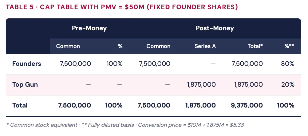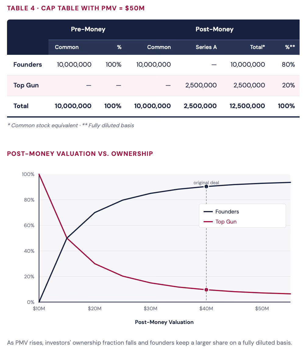 Imagine the founders and Top Gun renegotiate a higher PMV of $50 million (everything else unchanged). Top Gun still invests $10M at $4/share, still receives 2.5M shares. But now the founders end up owning 10 million shares — 80% of the company, up from 75%.