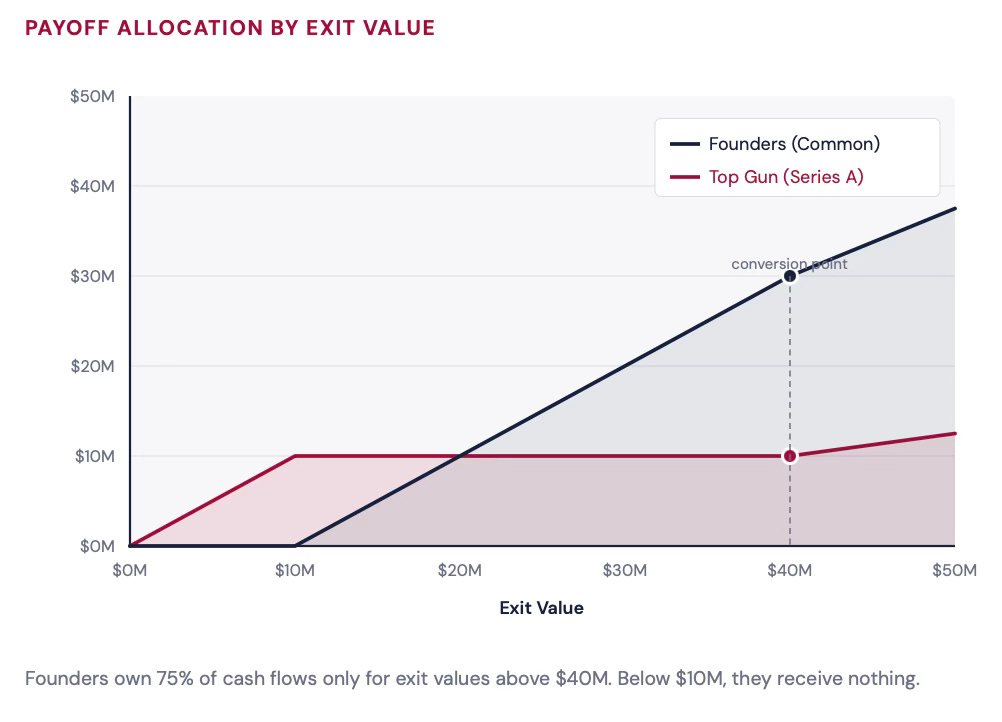 Founders own 75% of cash flows only for exit values above $40M. Below $10M, they receive nothing.