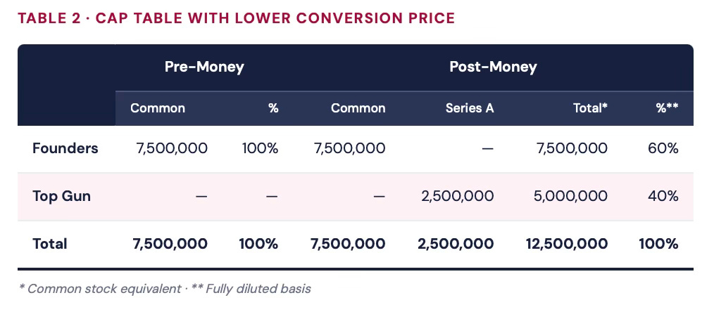 To appreciate the importance of this, imagine that Top Gun negotiated a better deal: 2.5 million Series A Preferred shares, each convertible into twocommon shares. The conversion price drops to $2, while the original issue price stays at $4.