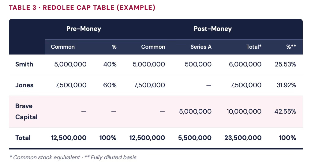 Problem: Brave Capital is buying 5 million of Redolee’s Series A preferred shares with a 2× conversion ratio. Redolee has two founders, Smith and Jones, who own 5 million and 7.5 million common shares respectively. Smith co-invests in the A round by acquiring 0.5 million Series A preferred shares. Construct the cap table.