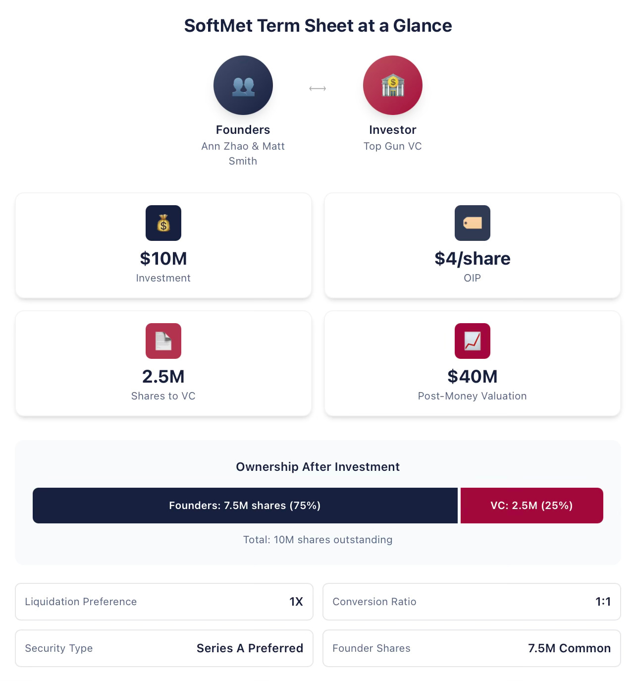 Assumption: Top Gun is the first outside investor in SoftMet. In reality, most VC rounds are preceded by angel or seed financing with different securities.