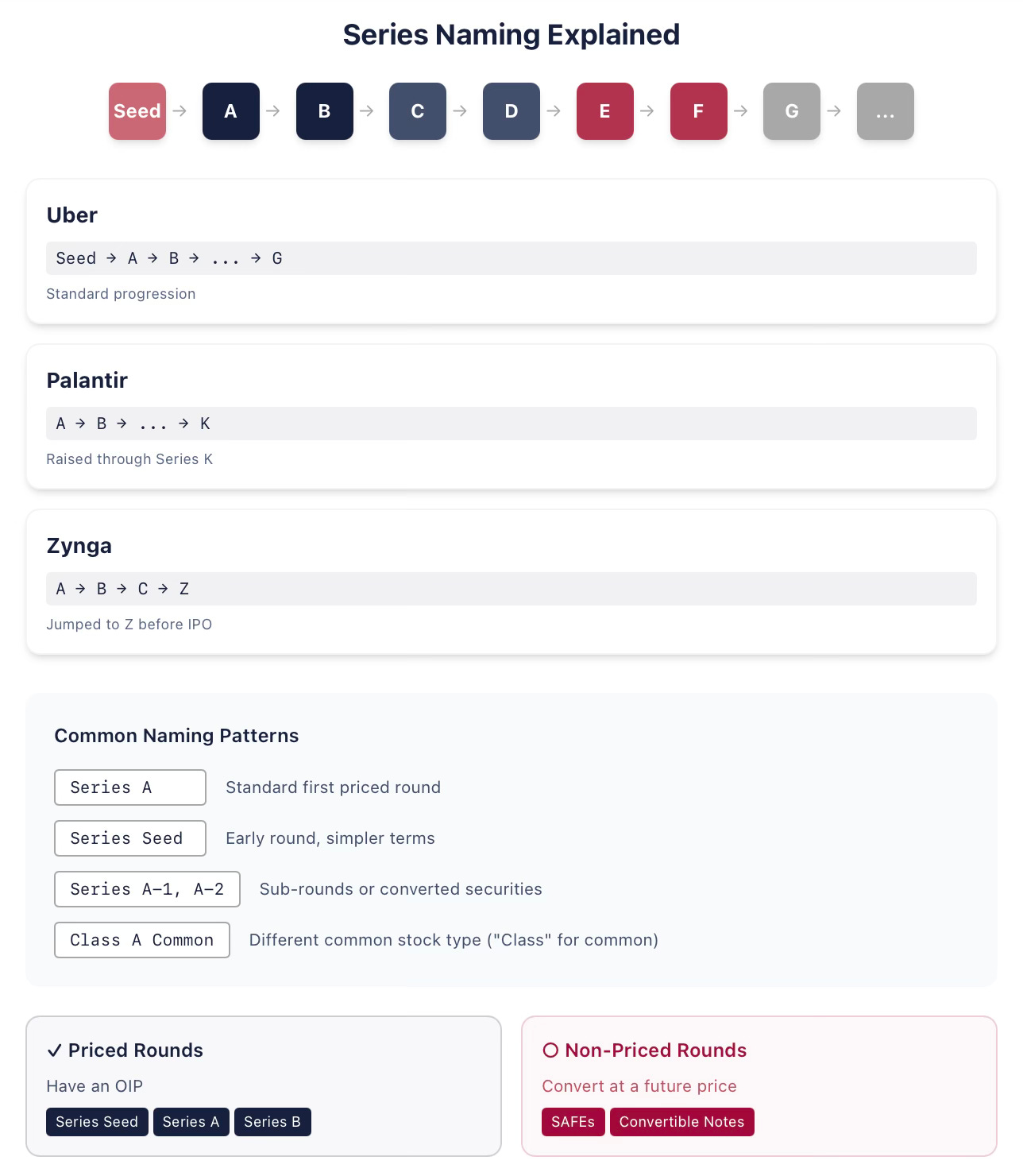 Lawyers advising VC investors and startups are quite creative in naming stuff, so there are many other variations on the naming possibilities. Sometimes these subtle name differences signify some specific arrangements. For instance, any series could also be followed or accompanied by additional numbered series (Series A may be followed by Series A-1, A-2, etc.). If a part of the same round, usually such Series A-1 stocks differ only slightly in some specific terms and are otherwise identical to Series A, often because of conversion of some outstanding securities into (almost) Series A. Alternatively, they could be a part of a completely different financing round, for example, because the company does not yet feel it reached the milestones that the market expects for Series B companies in this space.