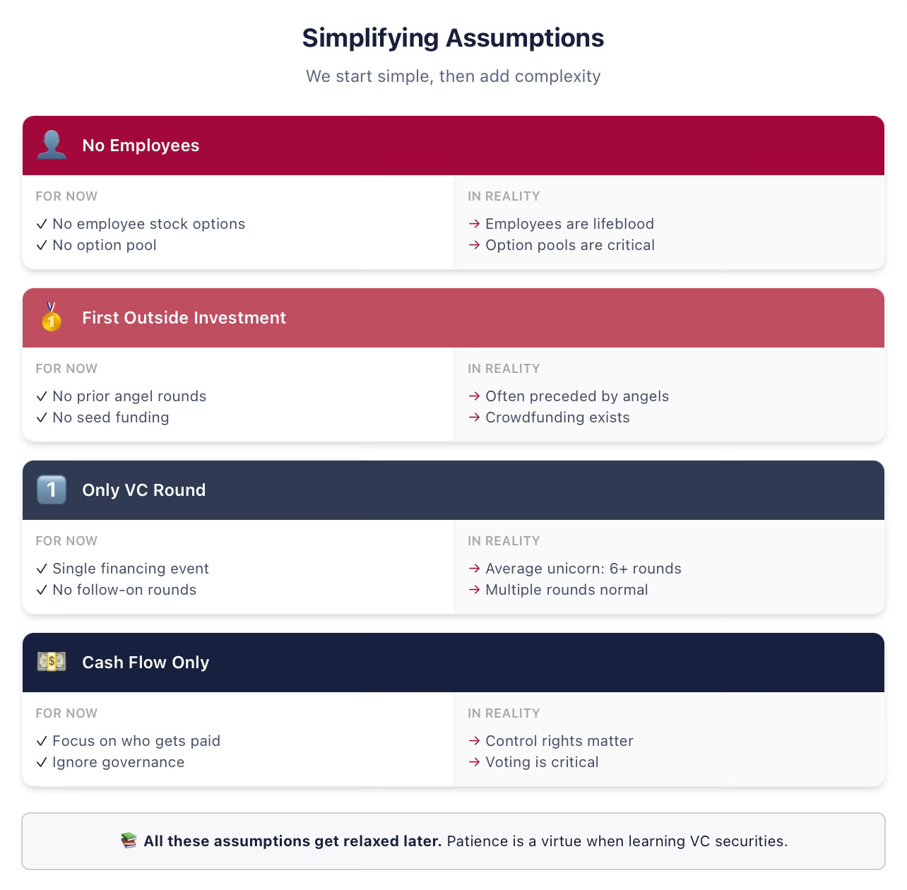 It is useful to summarize what I will be assuming throughout the first series of notes about the first VC round (and if the terms below are not familiar, this is exactly why we simplify for now!):