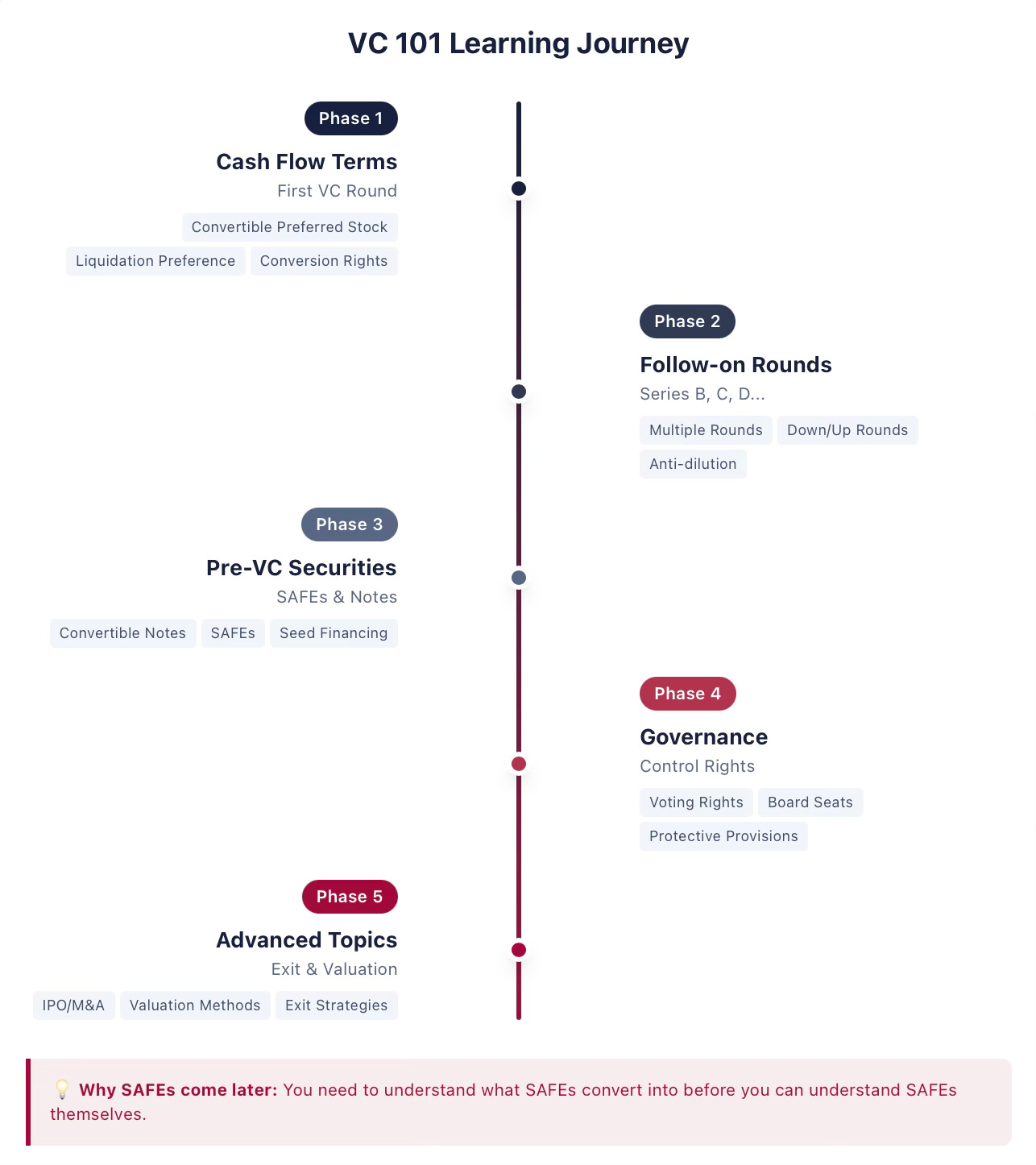 In the first several articles we will go straight into the heat of the matter and talk mostly about cash flow terms in the first VC round. Cash flow terms are basically rules on who gets what when it is time to divide the spoils. We will meet the most common financial security used in venture capital financing, convertible preferred stock. We will cover all the main contractual terms that determine the allocation of payoffs to entrepreneurs and investors. Once we cover the first VC round, we will proceed with covering follow-on VC rounds. Only then we will be ready to cover pre-VC rounds, including such wonderful securities as SAFEs and convertible notes. Many students are asking me, why on earth can’t we start with SAFEs – after all, this is the first security many founders issue these days. But the critical feature of a SAFE is its conversion into the security the startup will issue later on, and without knowing that security it is tough to understand SAFE properly. Once we cover the cash flow terms, we will discuss control rights, corporate governance, and conflicts of interest in startups. These are absolutely critical discussion points. As I tell my students again and again, “you can lose control in your startup only once. Once lost, it is lost forever.”